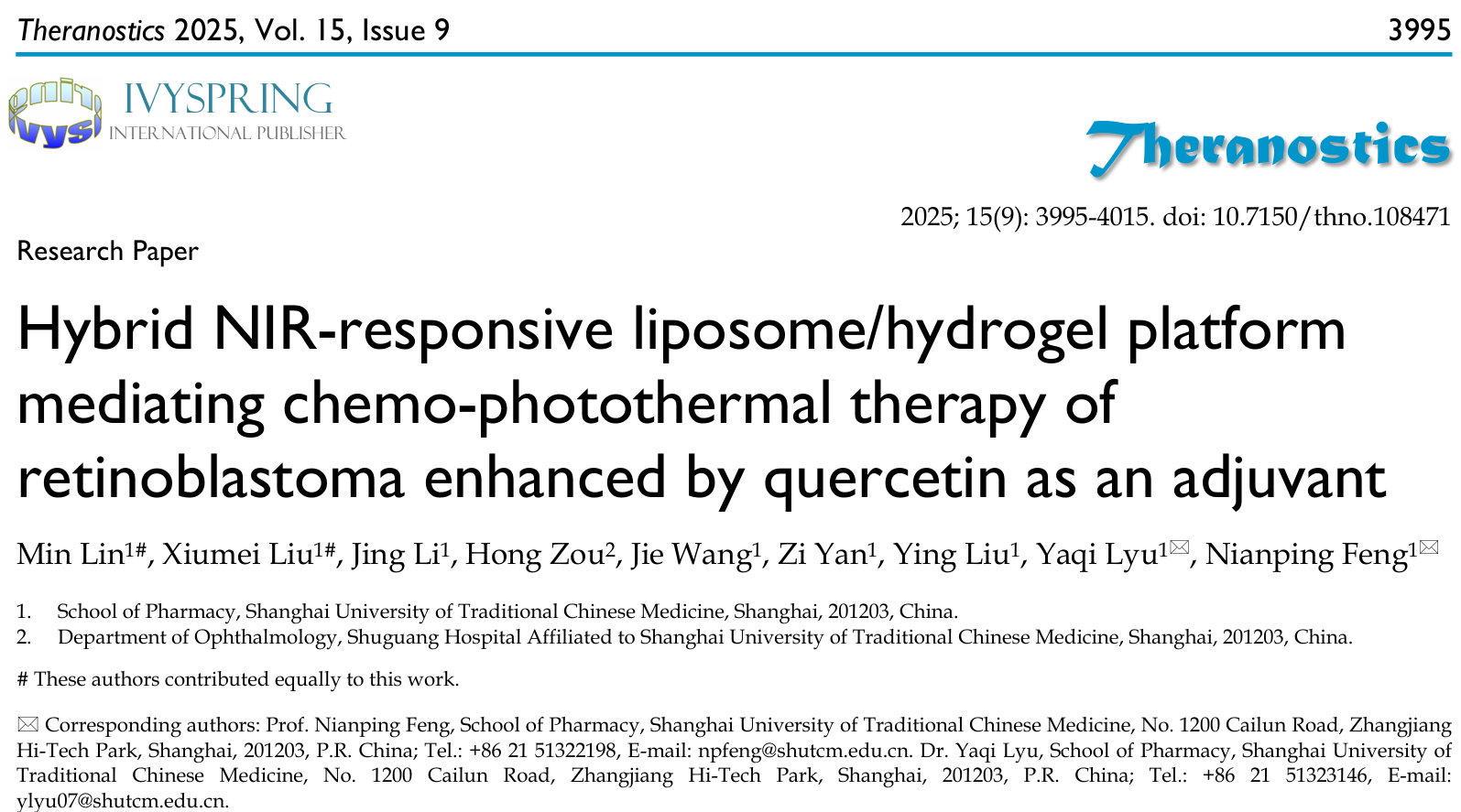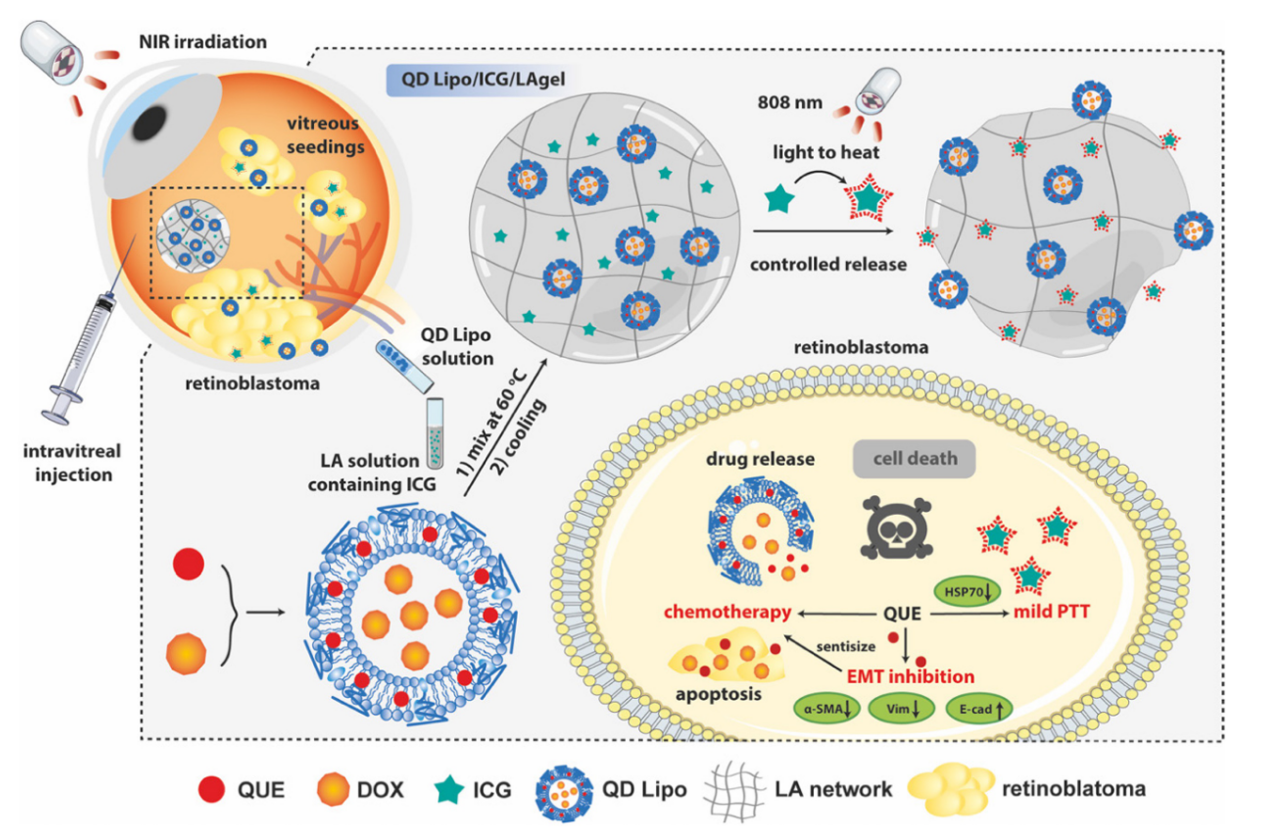 近日,女同av 冯年平/吕雅琪团队在生物医学1区期刊《Theranostics》(IF: 12.4)发表题为Hybrid NIR-responsive liposome/hydrogel platform mediating chemo-photothermal therapy of retinoblastoma enhanced by quercetin as an adjuvant的研究论文。该研究报道了一种基于共载槲皮素/多柔比星脂质体(QD Lipo)的吲哚菁绿-低熔点琼脂糖水凝胶(QD Lipo/ICG/LAgel)。QD Lipo/ICG/LAgel是一种具有光热响应能力的可注射水凝胶药物递送系统,通过玻璃体注射将QD Lipo/ICG/LAgel植入玻璃体腔,利用近红外光的照射远程控制负载脂质体与光敏剂的释放,通过玻璃体腔内的局部可控化疗-光热治疗联合提升视网膜母细胞瘤的疗效,为视网膜母细胞瘤的治疗提供新的模式。