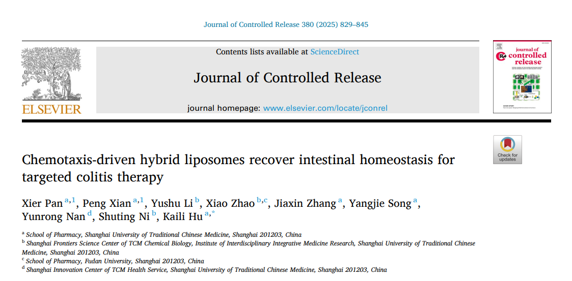 胡凯莉团队通过构建冰片修饰细菌外膜囊泡融合脂质体(BO/OMV-lipo@LU),实现了木犀草素向炎症结肠部位的口服靶向递送,有效修复肠道稳态,提高了木犀草素对结肠炎的治疗效果。研究成果Chemotaxis-driven hybrid liposomes recover intestinal homeostasis for targeted colitis therapy发表在药剂学领域权威国际期刊Journal of Controlled Release。