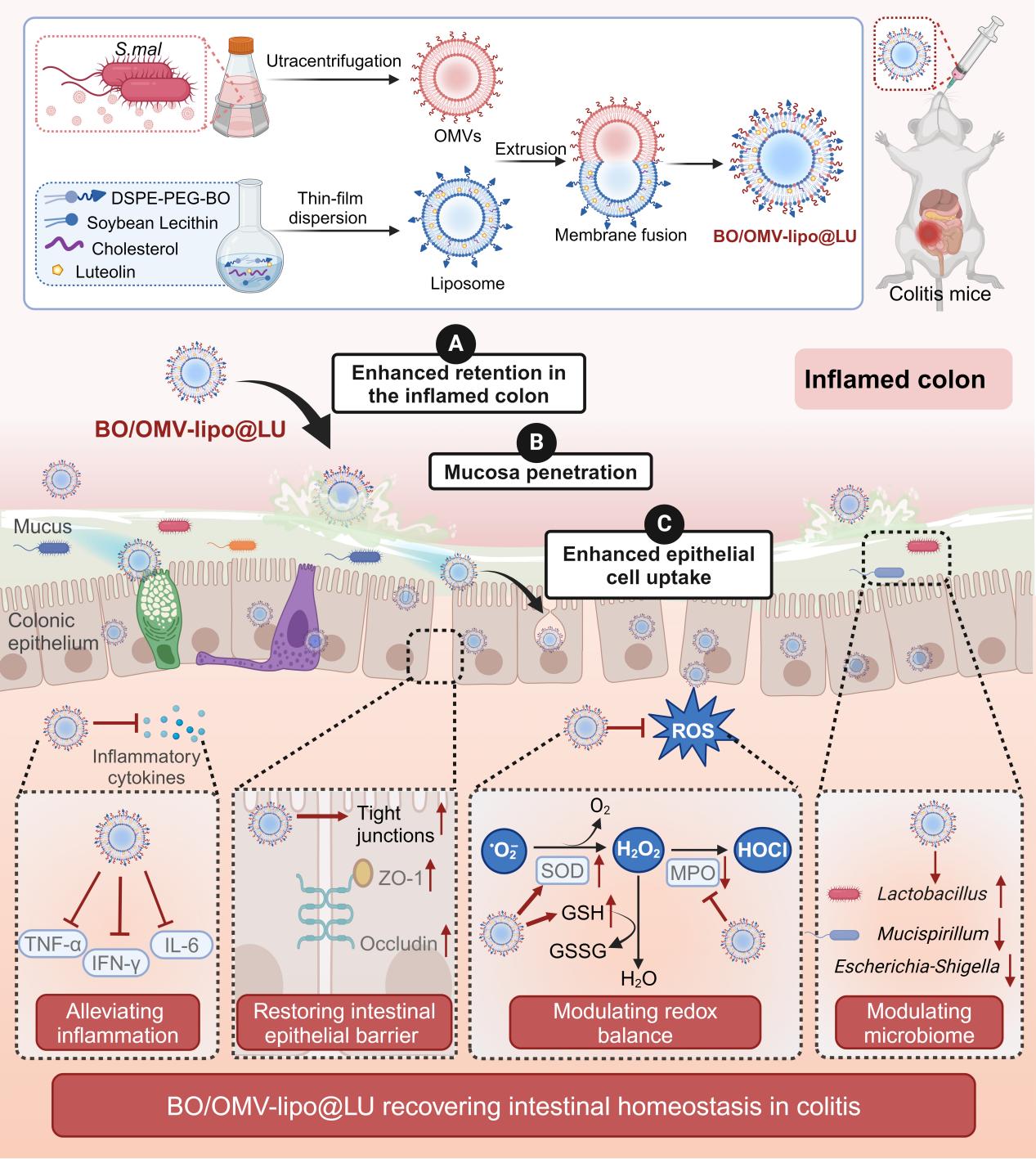 中药活性成分木犀草素具有多通路多靶点的作用特点,可通过抗炎、抗氧化、修复肠上皮屏障、调节免疫反应和肠道菌群等多种机制恢复肠道稳态,在治疗结肠炎方面显示出良好的前景。但木犀草素水溶性差,易发生氧化和降解,且结肠靶向性差,严重限制了其临床应用。本研究构建了冰片修饰细菌外膜囊泡融合脂质体(BO/OMV-lipo@LU),借助细菌外膜囊泡融合脂质体在炎症结肠的滞留,通过冰片修饰后进一步提高了肠上皮细胞的摄取,实现木犀草素向炎症结肠部位的口服靶向递送。研究结果证实,BO/OMV-lipo@LU口服给药后显著改善了肠道炎症,氧化应激、肠上皮屏障损伤以及肠道菌群紊乱,多方面结合有效恢复肠道稳态,显著提高了对于结肠炎的治疗效果。该研究借助中药冰片的引经特性提高了仿生纳米系统的靶向性,提高包载中药成分的体内稳定性和生物利用度,为口服结肠炎靶向药物递送及其治疗提供了一种新的策略。