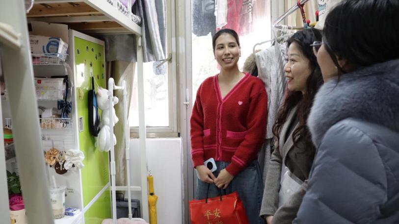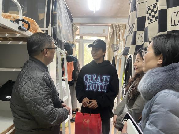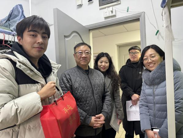 岁末将至,新春悄临。在2026年农历新年即将到来之际,校园中洋溢着温暖而浓厚的节日氛围。1月28日下午,校党委副书记周斌、女同av 领导班子及全体辅导员深入学生生活区,亲切慰问寒假期间留校的同学们,为大家送上节日慰问品,并致以诚挚的新春问候与美好祝福。