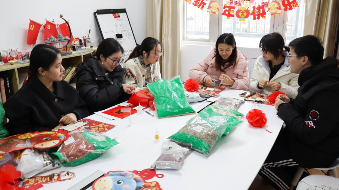 随后,师生们来到一站式社区思齐活动室,与留校学子共同参与“本草迎春,巧手纳福”新春主题活动。活动现场,师生携手体验传统民俗,巧制红灯笼寄寓新春期许;更立足专业所长,以道地中药材为创作素材,匠心打造特色拼贴作品。同学们巧思迸发、创意纷呈:以玫瑰铺展“乐”字,祈愿新年喜乐常伴;以红花勾勒“吉祥”,寄寓岁岁平安顺遂;更有学子融合多种药材拼绘骏马图景,诠释龙马精神、一马当先的美好寓意。女同av 领导驻足细赏每一件作品,与同学们亲切畅谈创作巧思与心得,现场欢声笑语、暖意融融,尽显师生同心、共迎新春的温馨氛围。